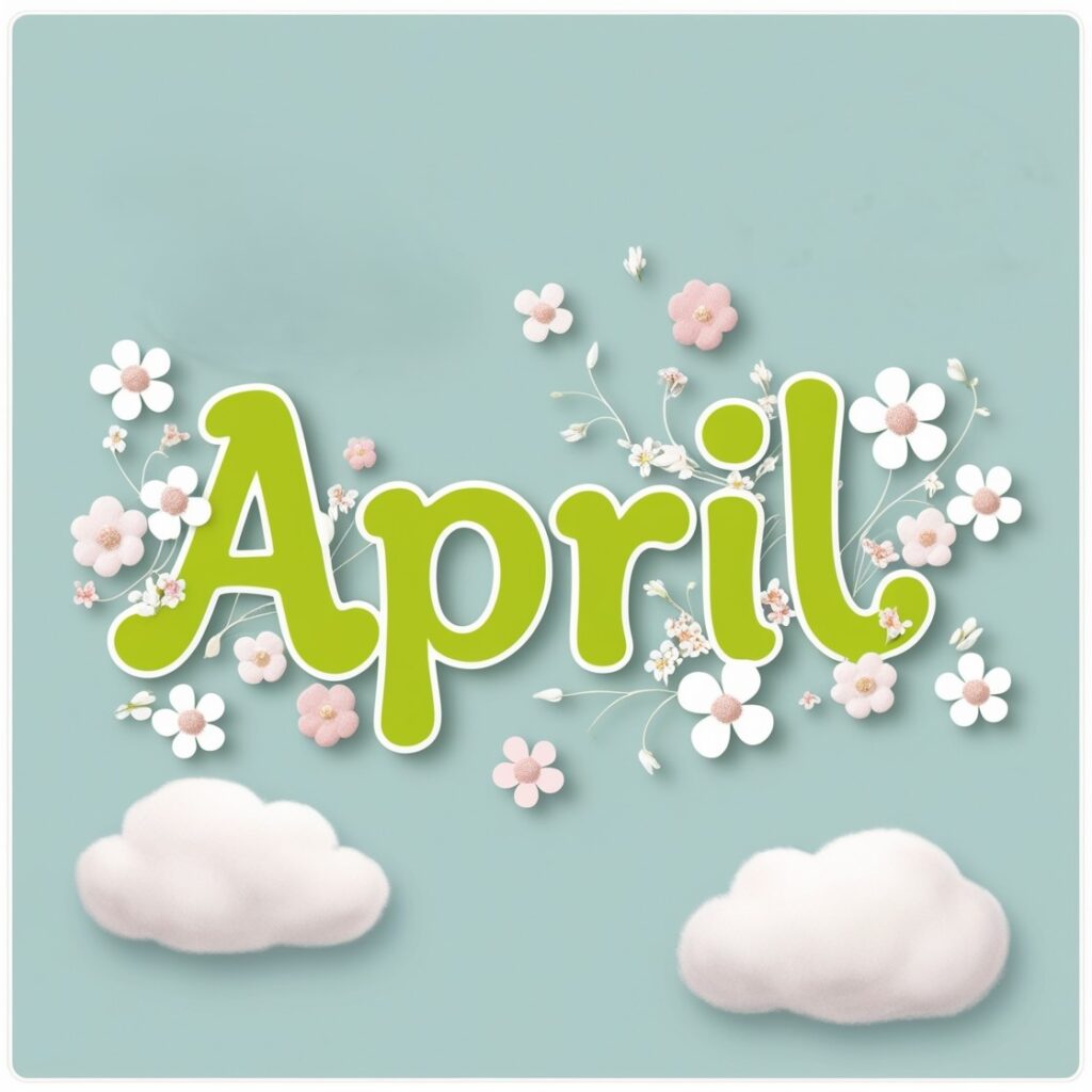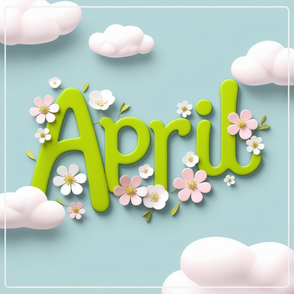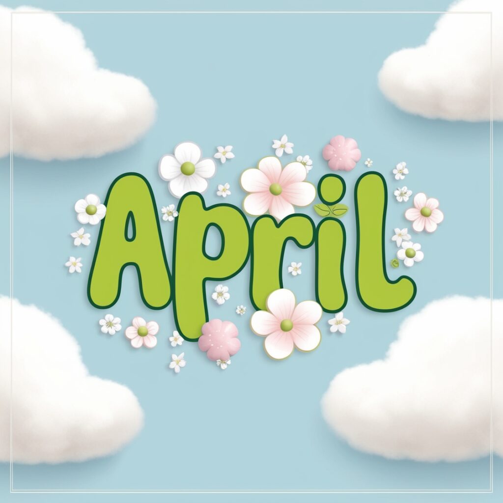 (Leonardo.ai) Create a whimsical word art logo featuring the month “April” in a vibrant, lime green font with rounded edges, playfully intertwined with delicate, white, and soft pink flowers of varying sizes, scattered across a serene, light blue background with puffy, white clouds drifting lazily, adding a sense of airiness and freedom, with the flowers and clouds subtly overlapping the text, giving the design a sense of movement and joy, and the entire logo framed by a thin, white border to provide a sense of containment and cohesion.
