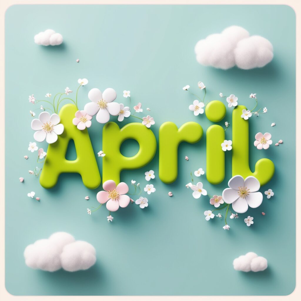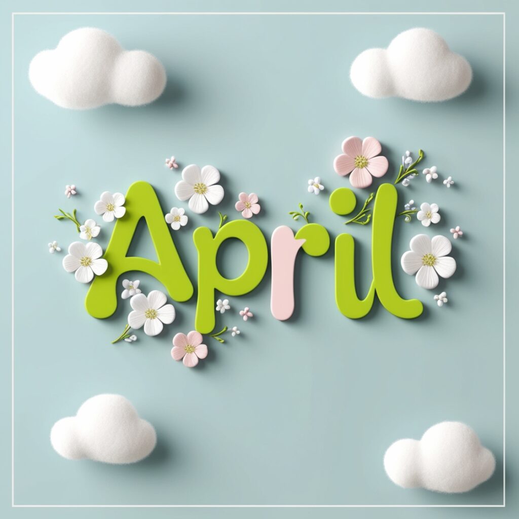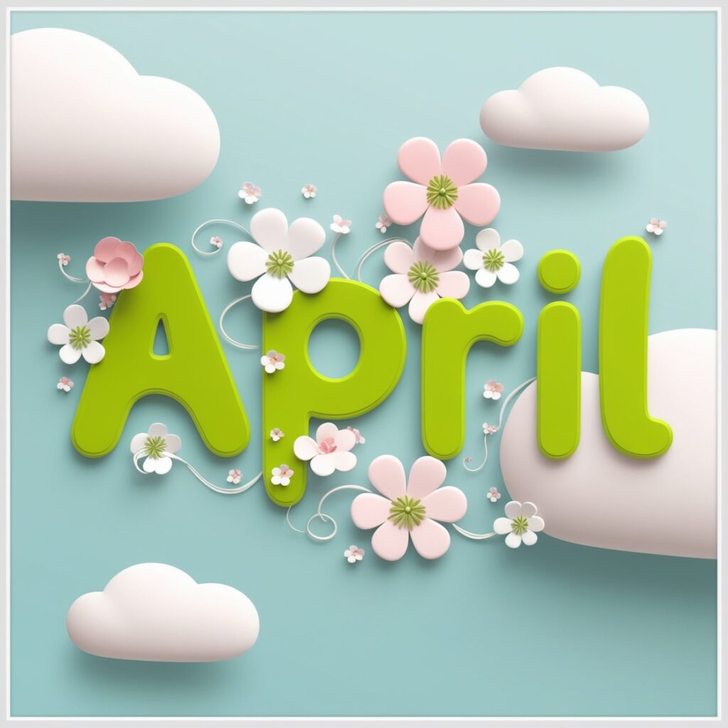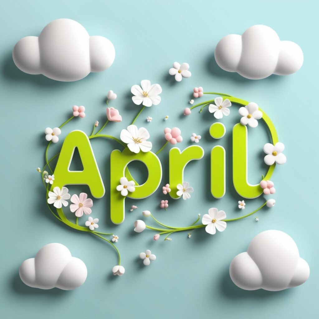 (Leonardo.ai) Create a whimsical word art logo featuring the month “April” in a vibrant, lime green font with rounded edges, playfully intertwined with delicate, white, and soft pink flowers of varying sizes, scattered across a serene, light blue background with puffy, white clouds drifting lazily, adding a sense of airiness and freedom, with the flowers and clouds subtly overlapping the text, giving the design a sense of movement and joy, and the entire logo framed by a thin, white border to provide a sense of containment and cohesion.